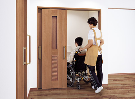上吊りタイプの引き戸にすれば、床にレールがないので、障害になることもありません。また、介助の必要な度合いによって、介助者も室内に入りやすい間口の広さも考える必要があります。