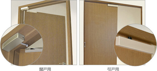 ドアの上部に付けるもので、ドアを油圧により開いたドアを一定の速度で自動的に静かに閉めるためのものです。また、ドアを開けたままにしておきたい場合に扉をある角度まで開いたままの状態で保持する機能を持つものもあります。また子どもの指をはさみ防止にも効果があります。