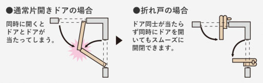 引き戸をつけるための戸を引き込むスペースを作る場所がなかったり、ドア同士がぶつかってしまうような狭い空間には、よくクローゼットなどで使われる折れ戸が便利です。扉が細く折れるので、前後の開閉スペースが浅くて済みます。