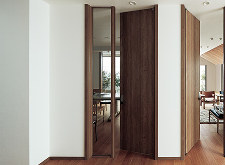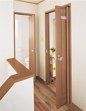 室内ドアで多く使われている一般的なドアです。引き戸のように周りにドアを引き込むスペースがなくても取り付けることができます。また、閉めた時に密閉性、遮音性が高くリビング入口、個室、トイレなどによく使われます。
