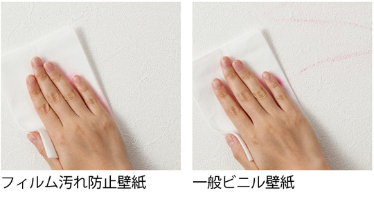 防汚クロスは、表面にフィルムをラミネート加工がしてあり、水拭きや中性洗剤で汚れがさっと落ちます。小さいお子さんのいるご家庭や、汚れやすい部位におすすめです。