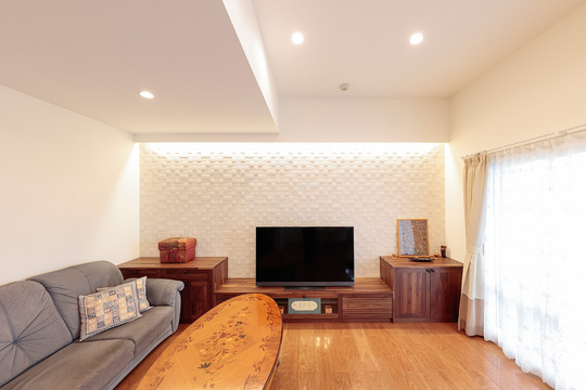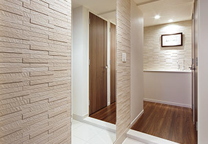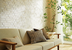 リビングの入ってまず目に入る面にアクセントとして使うと見栄えがします。ライティングを工夫することでテクスチュアが楽しめます。