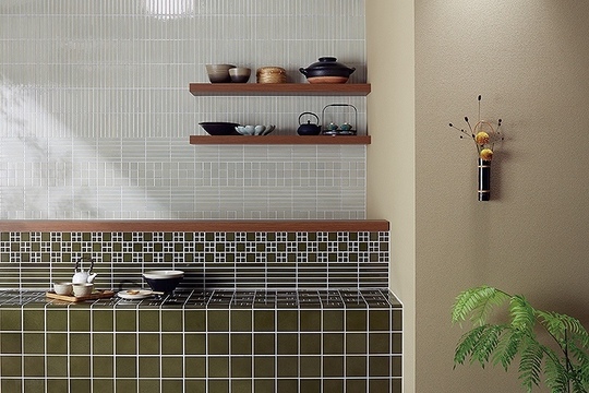 タイルの魅力はその陶器のつややかな質感でしょう。色、デザイン、大きさの種類が豊富で組み合わせは無限です。アクセントとして壁の一部に取り入れることでおしゃれな空間となります。