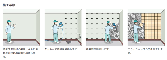 費用の目安は、エコカラットプラスの㎡単価は、施工費込みで20,000円程度(10㎡以上の場合)と考えておくと良いでしょう。珪藻土よりもコストが高めなので、お部屋の部分に使われることが多いです。工期は約2日です。