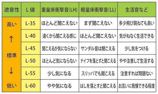 上階の床で生じる音が下の階でどの程度に聞こえるのかの基準として、決められている遮音等級をL値といい、音の伝わりにくさを表しています。このL値は数値が小さいほど、遮音性能が優れていることを示しています。