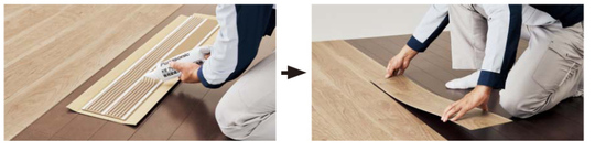 床材の裏面にはあらかじめ両面テープが貼ってあるので、専用接着剤を塗り、両面テープの剥離紙を剥がし、既存の床の上に貼っていきます。8畳程度であれば、約1日で工事が完了します。工事中の騒音も出ません。