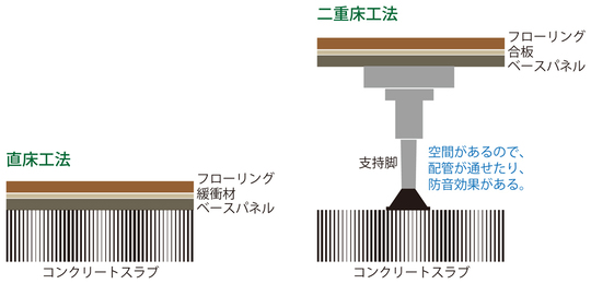 「直床」は、コンクリートスラブの上に直接床材を施工します。床材は裏に緩衝材が貼られた防音フローリングから選んで施工します。防音フローリングは、床を踏んだ感触が柔らかく感じられます。