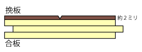 挽板と同じく、合板の基材とし、表面に挽板よりも薄い厚さ0.2ミリ程度の天然木の非常に薄い板を貼ったものです。目地が浅く、表面にコーティングがしてあるので掃除が楽です。傷やへこみがつくと、下地が見えてしまうことがあります。価格は、挽板の約半額で手頃です。