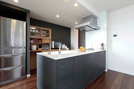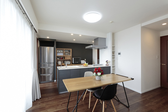 眺望がよく、晴れた日には遠くまで見晴らせる角部屋のLDKがよさを生かすために、キッチンの向きを壁向きからリビング方向に位置を変えました。このことにより、家事をしながらも、ご家族と交流ができ、また明るい眺めを楽しめるようになりました。キッチンや洗面所にはタッチ水栓を採用するなど、お掃除しやすく、清潔に備品を使える配慮もされています。お住まい全体を、ブラウンを基調にしたシックな色合いに統一し、飽きのこない落ち着いたインテリアに仕上がりました。