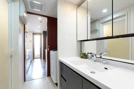 洗面所は、ブラウンを基調とした機能的な洗面化粧台を設置。広いボウルとカウンター、引き出し収納が便利です。洗面台のライトは鏡の下に手をかざすと自動点灯、水栓も自動で水が出ます。スイッチ等を触らずに清潔に使用できます。(LIXIL ルミシス)