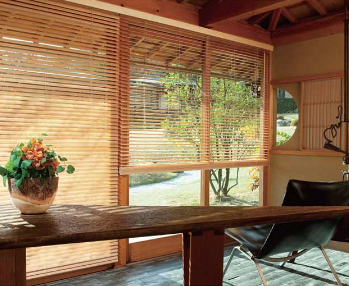 アルミやプラスチック、木などの素材でできた細長い板(スラット)を糸などでつなぎ、コードを引いたり巻き上げたり、チルトポール(棒)によってスラットの角度を調節することで、板の角度や窓を覆う範囲を調節します。