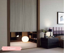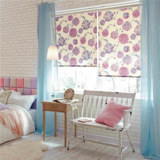 メリットは、シェードカーテンよりもすっきりと布が収納でき、全開時には窓が全面採光できます。またヒダがないので、布の柄や質感を絵のように楽しむことができます。開け閉めの少ない小窓におすすめです。また、部屋の間じきり、収納の目隠し、ホームシアターのスクリーンなどに使うのも便利です。