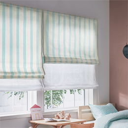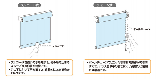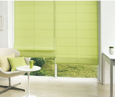 備え付けのコードを引いて、カーテン生地を平行にたたみあげていく形。閉めた時にフラットになり、引き上げた時には規則正しくたたみあがります。上下に動かせるので、直射日光だけをさえぎり、風を入れることもできます。あまり出入りしない窓におすすめです。