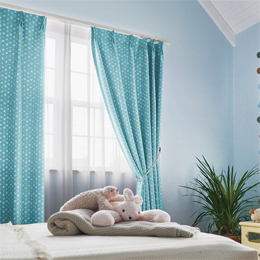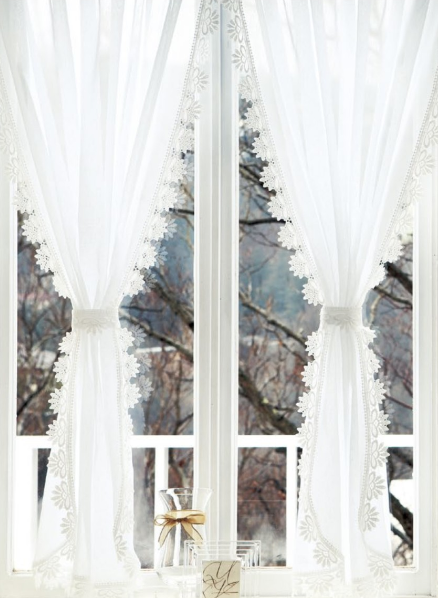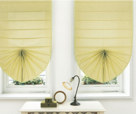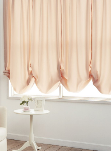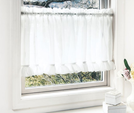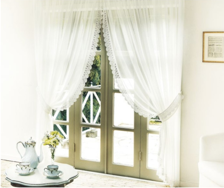 上部は一連でつながってカーテンが数枚に分かれている、小窓や出窓をエレガントに演出するスタイル。