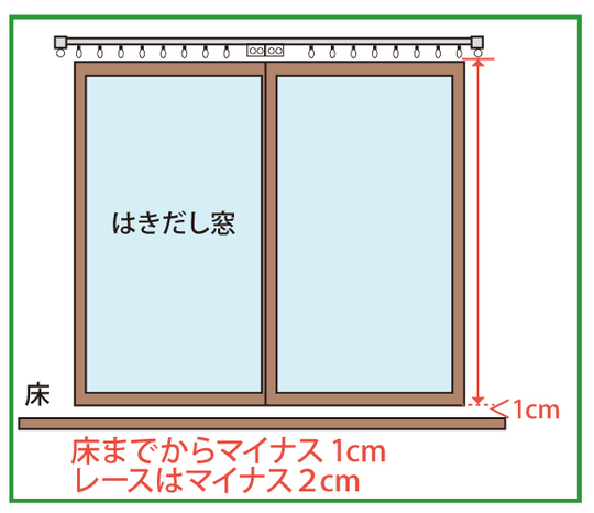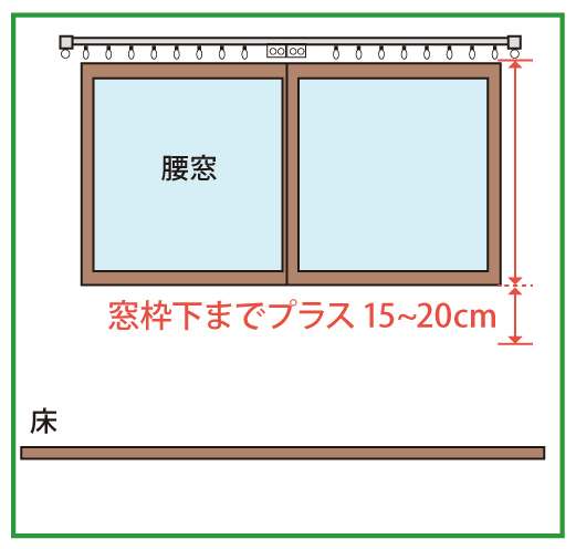 高さを測り、カーテンの丈を決めます。窓のタイプにより丈の決め方が変わります。いずれも上は固定ランナーの輪の下から測ります。「はきだし窓」の場合は、下は床から1cmくらい上まで、「腰窓」の場合は、下は窓枠の下まで測り、プラス15~20cmを足します。