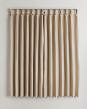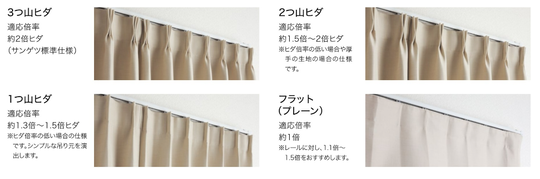 吊り元のヒダのつまみ方でカーテンの印象は大きく異なります。山が多いほど生地をたくさん使うのでボリューム感のあるリッチな印象のカーテンになります。
