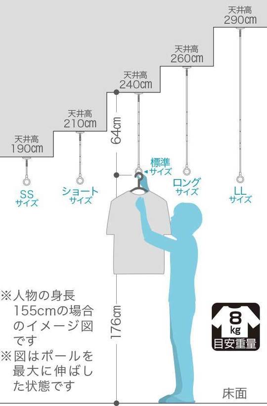 左右のサイズは3種類あります。脱水後の洗濯物を12キロ(ロングの場合)まで干すことができます。