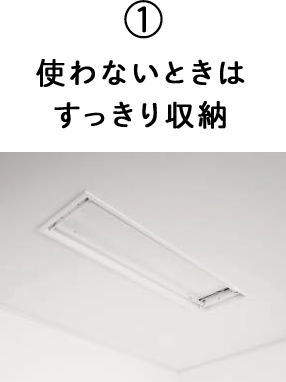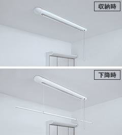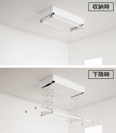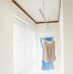 天井に取り付け、リモコン、またはスイッチで上げ下げできる電動式、紐や棒を操作する手動式があります。洗濯量に応じて、竿の本数、竿の長さが選べるものもあります。