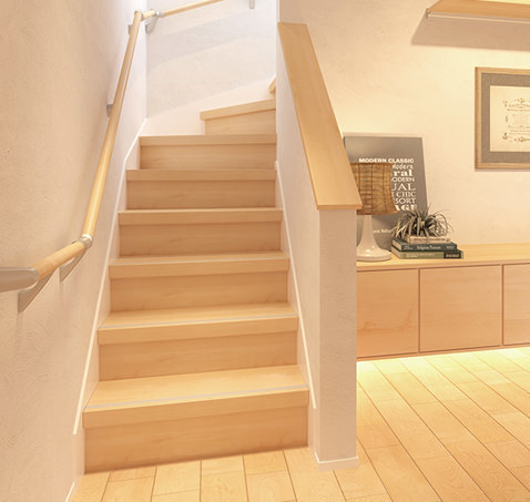 床から1m以上の階段には、建築基準法で手すりの設置が義務づけられています。折れ曲がる階段では、踊り場も続けて手すりを付けましょう。壁の片側に設置する場合は、折れ曲がる階段では、折れ曲がりの外側に付けます。直階段では、階段を下るときに利き手になる側に付けます。 手すりについて詳しくはこちら⇒