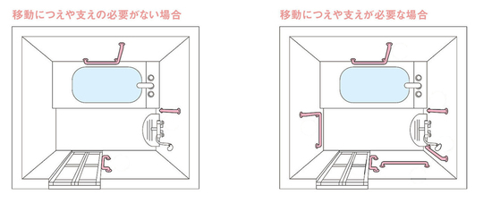 浴室は滑りやすく危険な場所です。浴室の手すりは滑りにくい形状のものを付けましょう。