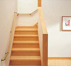 折れ曲がる階段は、踊り場も続けて手すりを付けましょう。壁の片側に設置する場合は、階段を下るとき に、利き手側に付けます。