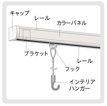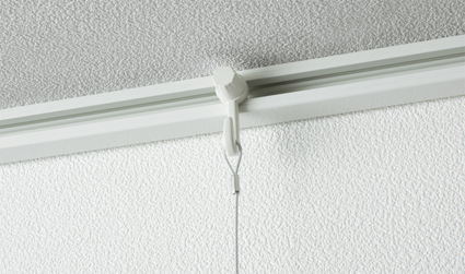 壁や天井に溝のあるレールを取り付け、溝にフックを通し、好きな場所に置きます。専用のワイヤーのループをフックに掛けて吊るします。ワイヤーの先端取付けられている可動式インテリアハンガーをプッシュボタンを押して好みの高さに動かし、位置を決めてロックします。インテリアハンガーに絵や時計など吊るしたいものを掛けます。