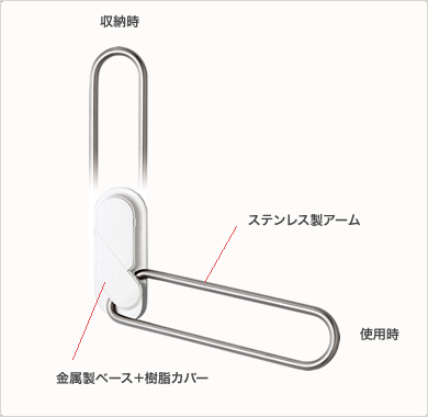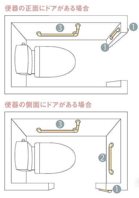 トイレにはL型手すりを付けると立ち座りが安全にできます。上げ下げできる手すりもあります。