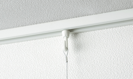 天井につけたレールからワイヤーを下げてものを掛けます。