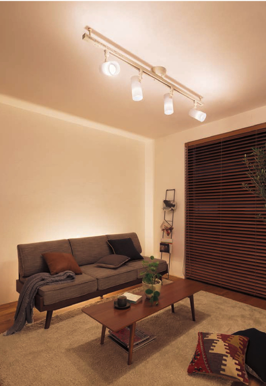スポットライトは、光を当てたい場所に自由に向きを変えられます。ライティングレールタイプは、可動範囲が広がります。お店などによく使われていますが、リビングでも絵を照らしたり、明るさがほしいところにスポットを当てることなど活用できます。