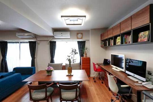 壁際には、おふたりそれぞれの快適なワーキングスペースができました。吊戸棚には、資料もきれいに収納できます。