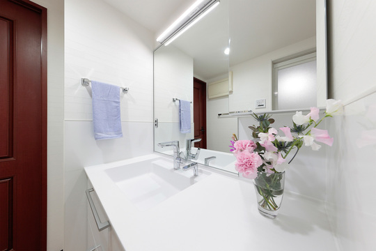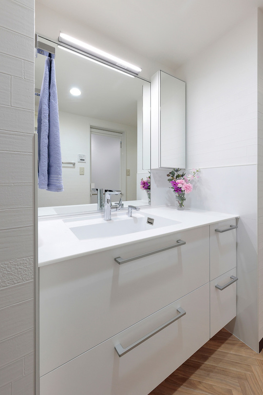 洗面ボウルが広くなり収納も増えました。鏡は大きく見渡せる1枚鏡にこだわりました。右手にはコンパクトな鏡付き収納をつけました。