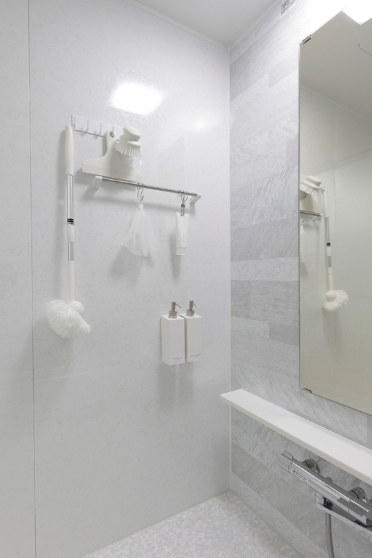 浴室の壁には鉄が入っているので、マグネットがつきます。I様は、磁石グッズを使って壁に浴室用品を使いやすいように配置されています。お掃除もしやすく、カウンターが広く使えます。