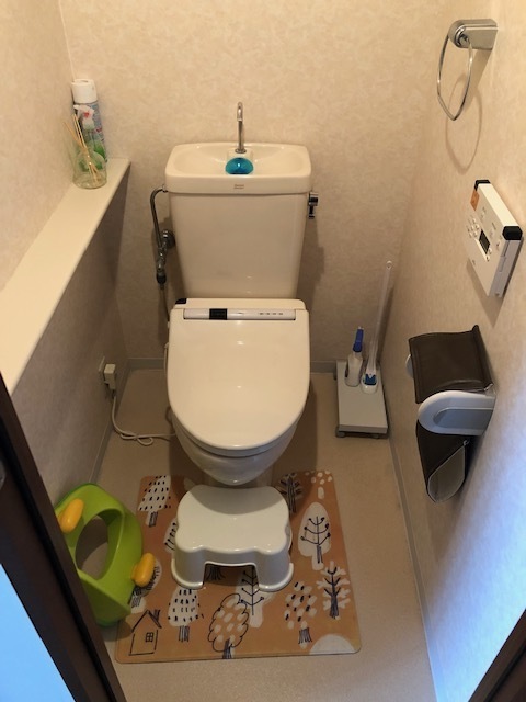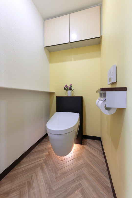 トイレは、便器が床から浮いている「フロート型」を選びました。床が汚れてもきれいに掃除ができます。タンクには、木目調のカバーがつき高級感があります。明るい色のクロスと床に張り替えました。