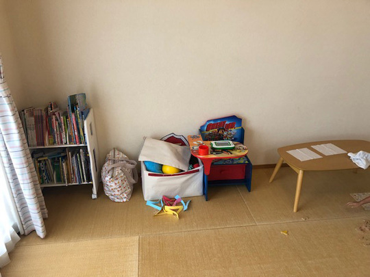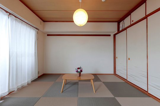 リビングに続く和室の畳を、憧れの琉球畳風にリフォームしました。畳は強度があり水拭きができる樹脂素材のものです。カラーバリエーションも豊富で、半畳の畳を市松模様におしゃれな色合わせで配置しました。お子様たちが楽しく遊べるスペースになっています。汚れてもきれいに掃除ができます。