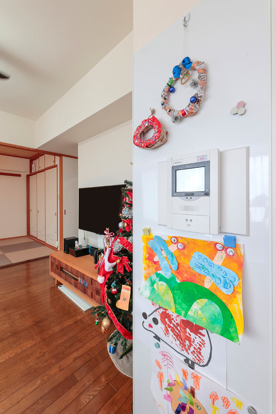 リビングのキッチン入口にもマグボードを貼り、お子様の工作などを気軽に飾れるようになりました。