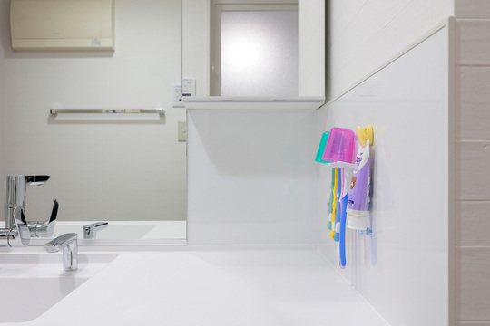 周囲の壁には磁石が付く「マグボード」を貼り、マグネットを利用して小さなお子様にも届きやすく日用品を収納できます。また洗面台にものを置かないので掃除が楽にできます。