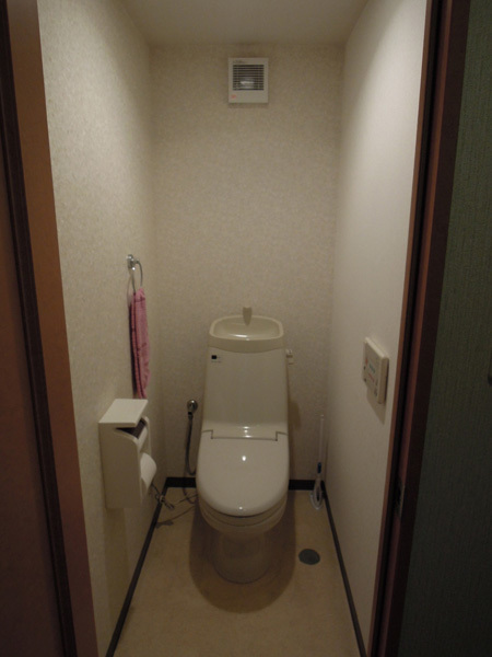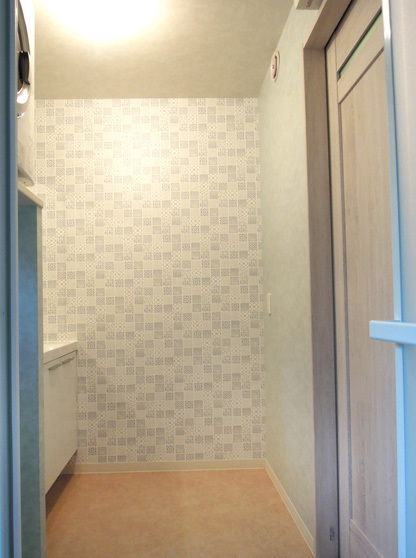 地下1階のトイレ。ホワイトウッド風のクロスが、おしゃれです。