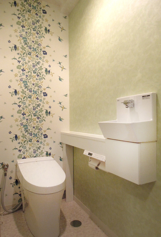 1階のトイレはグリーンとアクセントクロスがさわやか。トイレはタンクレス、手洗い器もつけました。