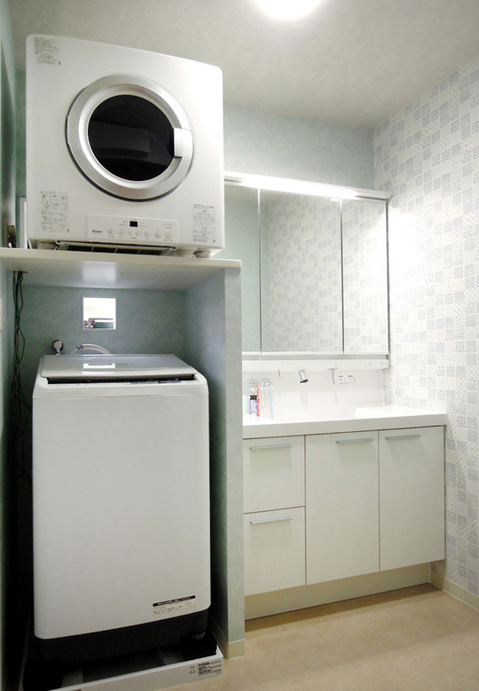 洗面所は、収納の多い洗面化粧台、ガス衣類乾燥器の「乾太くん」、洗濯機置き場を設置。すっきりと明るく使いやすくなりました。