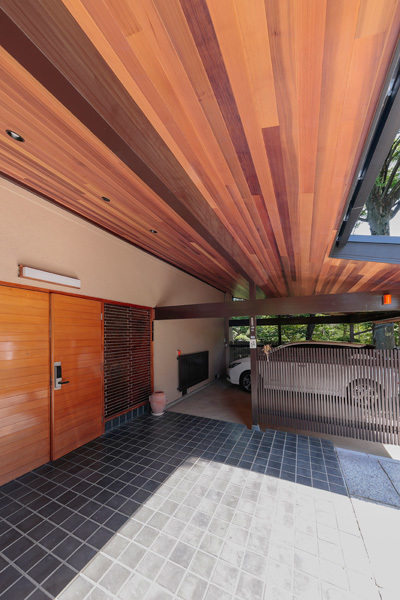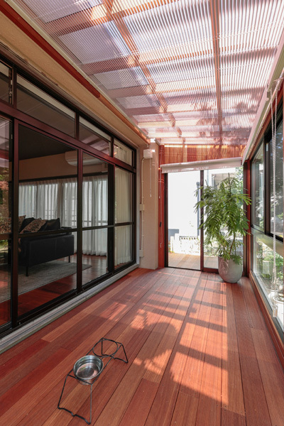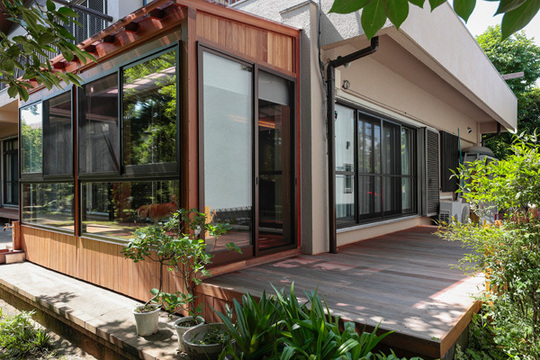 庭側にサンルームを増築。緑のお庭に似合う堅牢なバツー材で制作しました。縁側と広いウッドデッキも新しく作りました。
