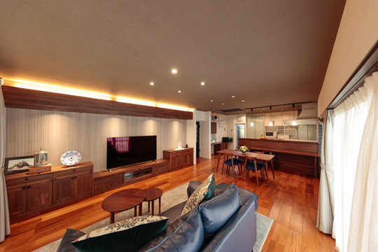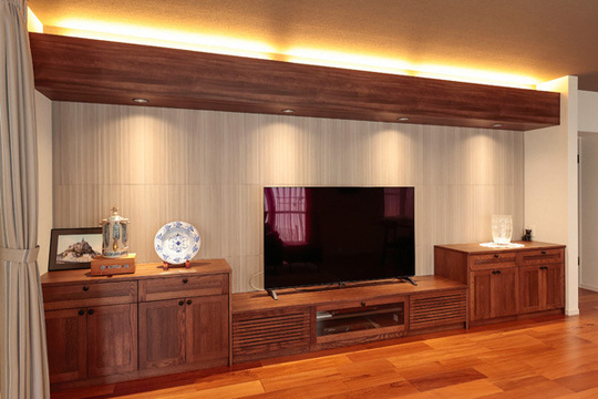 リビング正面の壁はエコカラットプラスを貼りました。落ち着いた色調の品格のあるお部屋を演出しています。間接照明とスポットライトをつけると、立体感のある表情が浮かび上がります。収納は、木の風合いが美しいシステム収納を設置しました。