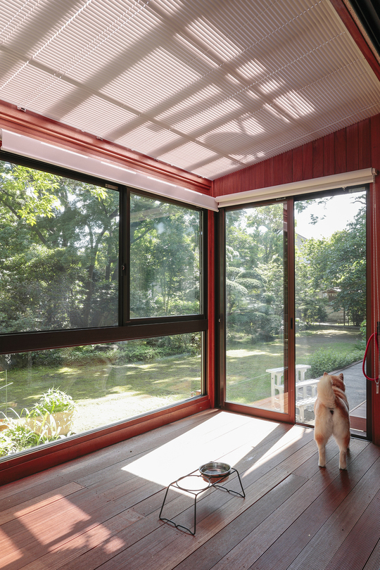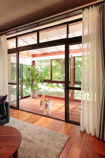 お庭に面した先に、犬も遊べるサンルームを増築しました。床暖房、断熱窓を設置し、1年中快適なリビングになりました。