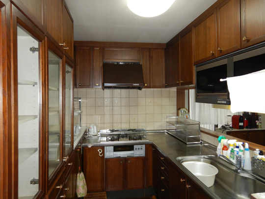 L字型のキッチンは、収納が取り出しにくく、また移動も大変でした。