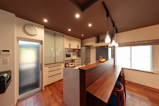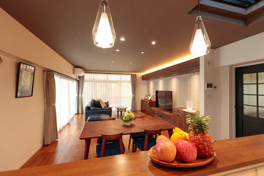 キッチンの壁がなくなり、開放的なダイニングキッチンになりました。奥行のあるカウンターは、簡単な食事や仕事など便利に使うことができます。モダンなデザインのペンダントライトが、やさしく照らします。