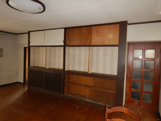 壁面には大きな古い収納がありました。室内ドアは廊下との段差がある古いものでした。