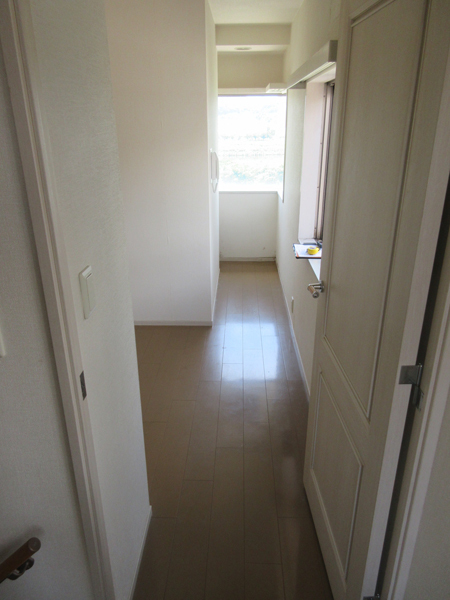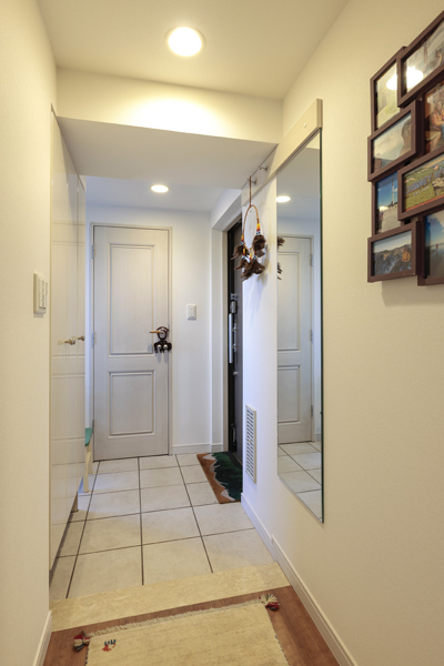 玄関。左手には、バルコニーに出られるドアもある明るい玄関です。正面のドアの向こうは、クローゼットになっています。