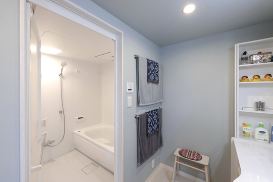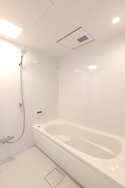 浴室は、清潔感のあるホワイト系でまとめました。ほっカラリ床で冬も温かです。 (TOTO )