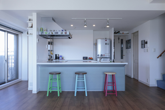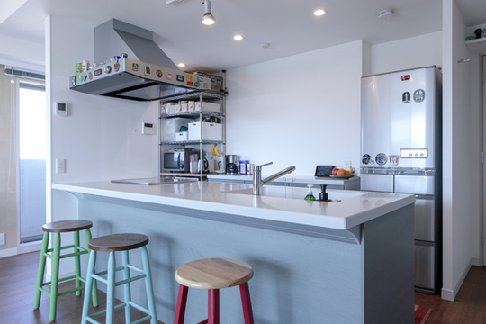 もとあった壁と収納を取払い、オープン型キッチンにリフォームしました。風通しと採光が良くなり、キッチンからの眺めもよくなりました。ハイチェアは、アメリカの古道具屋さんで購入されたもので、ご夫妻でカウンターに合わせて高さを直し、ペイントされたそうです。