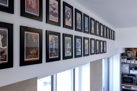 天井近くにずらりと並んだフレームは、今まで訪ねられたアメリカの州のポストカードだそうです。 思い出の品々をすてきなインテリアにされています。