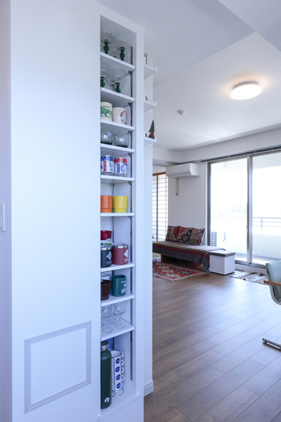 キッチン脇の壁裏に便利な棚収納を作りました。ここにも各地で集められたかわいい食器や雑貨が並んでいます。